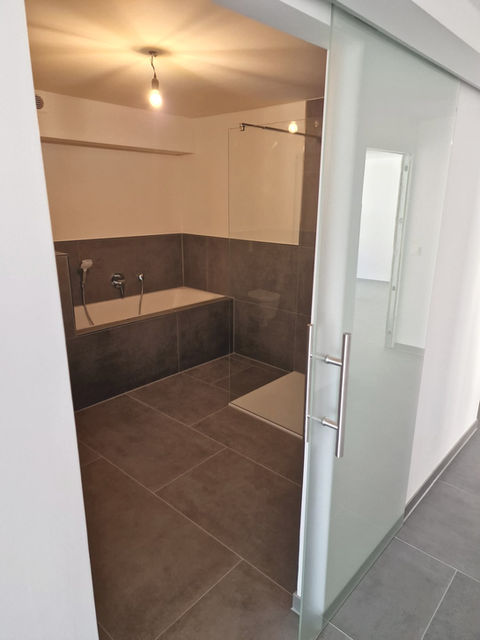 Ein durchgängig gefliestes Bad mit einer tiefen Duschwanne waren die Vorgaben. Der kunde suchte sich große Fliesen aus, die das relativ kleine Bad größer wirken lassen. Die Dusche ist geräumig und mit einer Glaswand versehen um den Raum nicht zu voll wirken zu lassen...